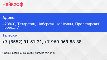Чайкофф по адресу 423800, Татарстан, Набережные Челны, Пролетарский проезд, 7 в дальнейшем Организация, размещена в следующих категориях:
