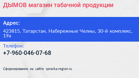 ДЫМОВ, магазин табачной продукции по адресу 423815, Татарстан, Набережные Челны, 30-й комплекс, 19а в дальнейшем Организация, размещена в следующих категориях: