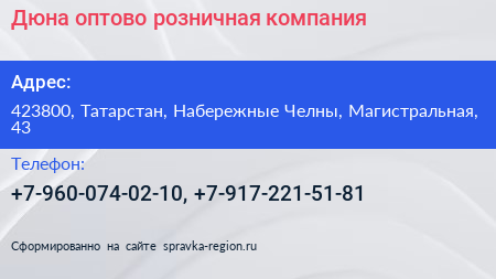 Дюна, оптово-розничная компания по адресу 423800, Татарстан, Набережные Челны, Магистральная, 43 в дальнейшем Организация, размещена в следующих категориях: