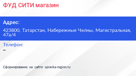 ФУД СИТИ, магазин по адресу 423800, Татарстан, Набережные Челны, Магистральная, 47а/4 в дальнейшем Организация, размещена в следующих категориях: