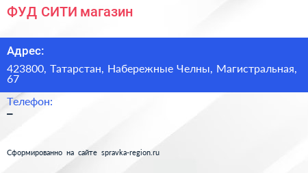 ФУД СИТИ, магазин по адресу 423800, Татарстан, Набережные Челны, Магистральная, 67 в дальнейшем Организация, размещена в следующих категориях: