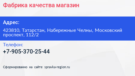 Фабрика качества, магазин по адресу 423810, Татарстан, Набережные Челны, Московский проспект, 112/2 в дальнейшем Организация, размещена в следующих категориях: