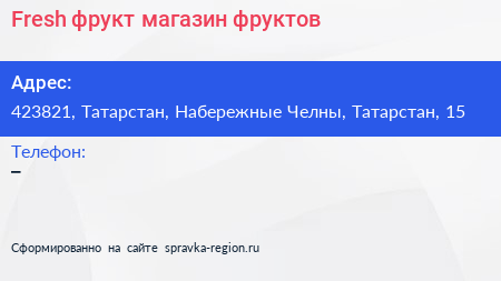 Fresh фрукт, магазин фруктов по адресу 423821, Татарстан, Набережные Челны, Татарстан, 15 в дальнейшем Организация, размещена в следующих категориях: