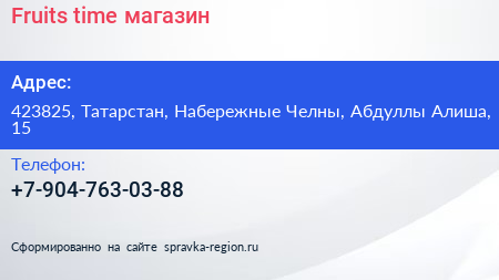 Fruits timе, магазин по адресу 423825, Татарстан, Набережные Челны, Абдуллы Алиша, 15 в дальнейшем Организация, размещена в следующих категориях: