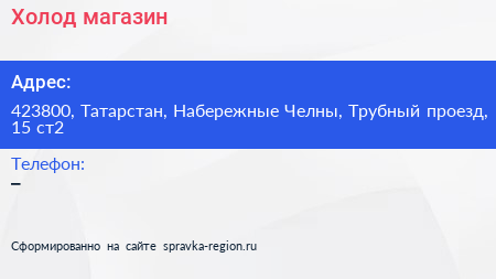Холод, магазин по адресу 423800, Татарстан, Набережные Челны, Трубный проезд, 15 ст2 в дальнейшем Организация, размещена в следующих категориях: