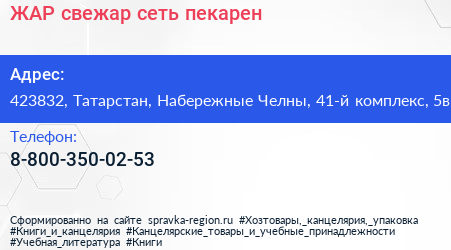 ЖАР свежар, сеть пекарен по адресу 423832, Татарстан, Набережные Челны, 41-й комплекс, 5в в дальнейшем Организация, размещена в следующих категориях:
