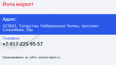 Йола-маркет по адресу 423821, Татарстан, Набережные Челны, проспект Сююмбике, 58а в дальнейшем Организация, размещена в следующих категориях: