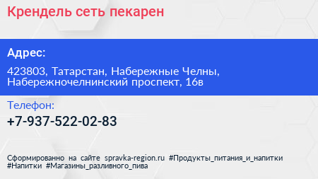 Крендель, сеть пекарен по адресу 423803, Татарстан, Набережные Челны, Набережночелнинский проспект, 16в в дальнейшем Организация, размещена в следующих категориях: