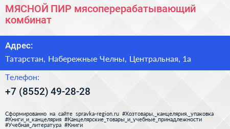 МЯСНОЙ ПИР, мясоперерабатывающий комбинат по адресу Татарстан, Набережные Челны, Центральная, 1а в дальнейшем Организация, размещена в следующих категориях: