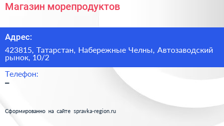 Магазин морепродуктов по адресу 423815, Татарстан, Набережные Челны, Автозаводский рынок, 10/2 в дальнейшем Организация, размещена в следующих категориях: