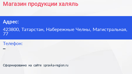 Магазин продукции халяль по адресу 423800, Татарстан, Набережные Челны, Магистральная, 77 в дальнейшем Организация, размещена в следующих категориях:
