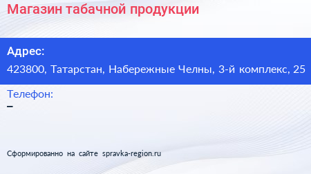 Магазин табачной продукции по адресу 423800, Татарстан, Набережные Челны, 3-й комплекс, 25 в дальнейшем Организация, размещена в следующих категориях: