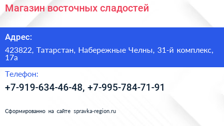Магазин восточных сладостей по адресу 423822, Татарстан, Набережные Челны, 31-й комплекс, 17а в дальнейшем Организация, размещена в следующих категориях: