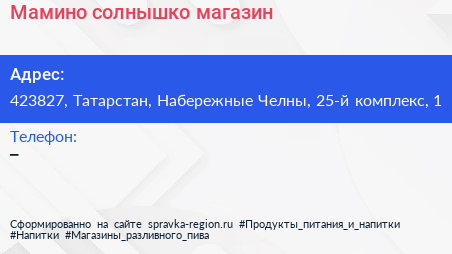 Мамино солнышко, магазин по адресу 423827, Татарстан, Набережные Челны, 25-й комплекс, 1 в дальнейшем Организация, размещена в следующих категориях: