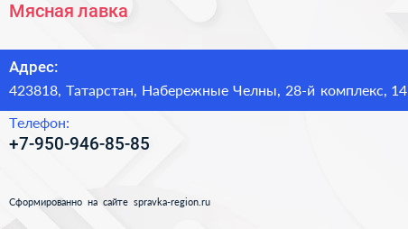 Мясная лавка по адресу 423818, Татарстан, Набережные Челны, 28-й комплекс, 14 в дальнейшем Организация, размещена в следующих категориях: