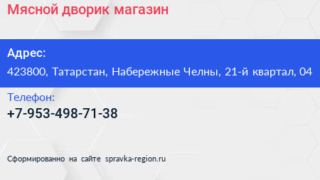 Мясной дворик, магазин по адресу 423800, Татарстан, Набережные Челны, 21-й квартал, 04 в дальнейшем Организация, размещена в следующих категориях:
