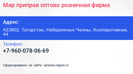 Мир приправ, оптово-розничная фирма по адресу 423802, Татарстан, Набережные Челны, Кооперативная, 44 в дальнейшем Организация, размещена в следующих категориях: