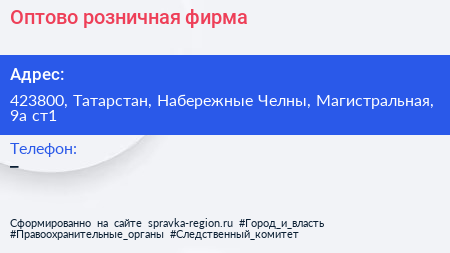 Оптово-розничная фирма по адресу 423800, Татарстан, Набережные Челны, Магистральная, 9а ст1 в дальнейшем Организация, размещена в следующих категориях: