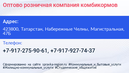 Оптово-розничная компания комбикормов по адресу 423800, Татарстан, Набережные Челны, Магистральная, 47Б в дальнейшем Организация, размещена в следующих категориях: