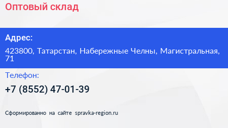 Оптовый склад по адресу 423800, Татарстан, Набережные Челны, Магистральная, 71 в дальнейшем Организация, размещена в следующих категориях: