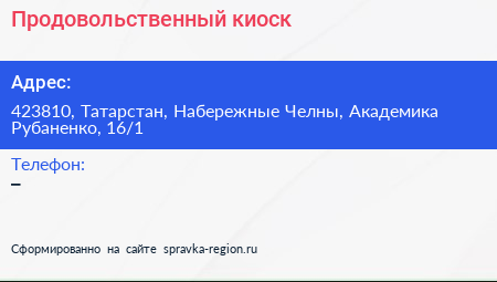 Продовольственный киоск по адресу 423810, Татарстан, Набережные Челны, Академика Рубаненко, 16/1 в дальнейшем Организация, размещена в следующих категориях: