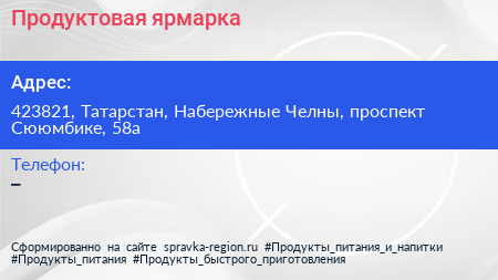 Продуктовая ярмарка по адресу 423821, Татарстан, Набережные Челны, проспект Сююмбике, 58а в дальнейшем Организация, размещена в следующих категориях: