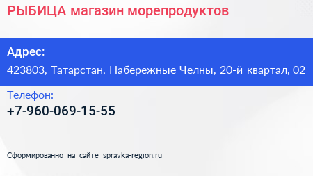 РЫБИЦА, магазин морепродуктов по адресу 423803, Татарстан, Набережные Челны, 20-й квартал, 02 в дальнейшем Организация, размещена в следующих категориях: