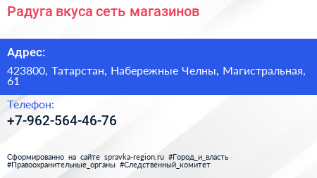 Радуга вкуса, сеть магазинов по адресу 423800, Татарстан, Набережные Челны, Магистральная, 61 в дальнейшем Организация, размещена в следующих категориях:
