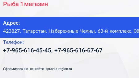 Рыба #1, магазин по адресу 423827, Татарстан, Набережные Челны, 63-й комплекс, 08 в дальнейшем Организация, размещена в следующих категориях: