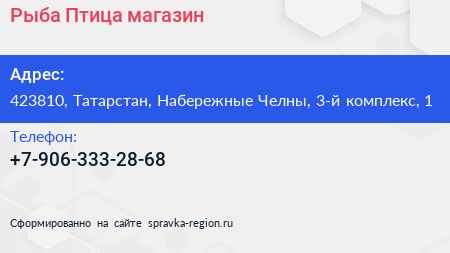 Рыба & Птица, магазин по адресу 423810, Татарстан, Набережные Челны, 3-й комплекс, 1 в дальнейшем Организация, размещена в следующих категориях: