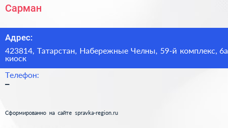 Сарман по адресу 423814, Татарстан, Набережные Челны, 59-й комплекс, 6а киоск в дальнейшем Организация, размещена в следующих категориях: