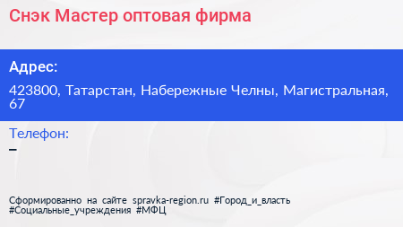 Снэк-Мастер, оптовая фирма по адресу 423800, Татарстан, Набережные Челны, Магистральная, 67 в дальнейшем Организация, размещена в следующих категориях: