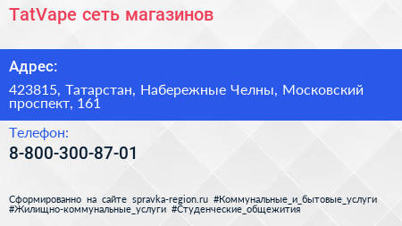 #TatVape, сеть магазинов по адресу 423815, Татарстан, Набережные Челны, Московский проспект, 161 в дальнейшем Организация, размещена в следующих категориях: