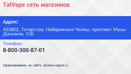 #TatVape, сеть магазинов по адресу 423802, Татарстан, Набережные Челны, проспект Мусы Джалиля, 55Б в дальнейшем Организация, размещена в следующих категориях: