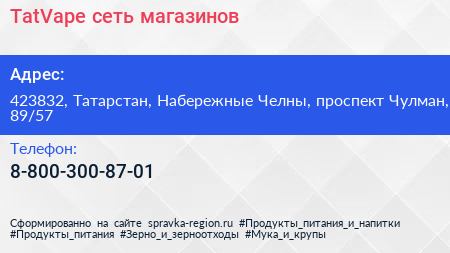 #TatVape, сеть магазинов по адресу 423832, Татарстан, Набережные Челны, проспект Чулман, 89/57 в дальнейшем Организация, размещена в следующих категориях: