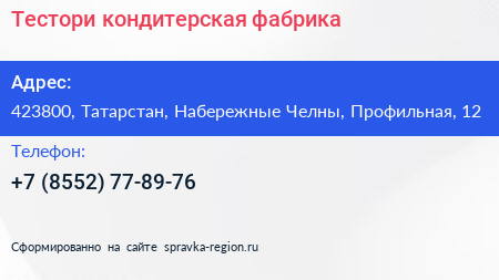 Тестори, кондитерская фабрика по адресу 423800, Татарстан, Набережные Челны, Профильная, 12 в дальнейшем Организация, размещена в следующих категориях: