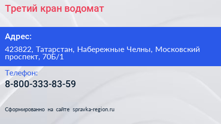 Третий кран, водомат по адресу 423822, Татарстан, Набережные Челны, Московский проспект, 70Б/1 в дальнейшем Организация, размещена в следующих категориях: