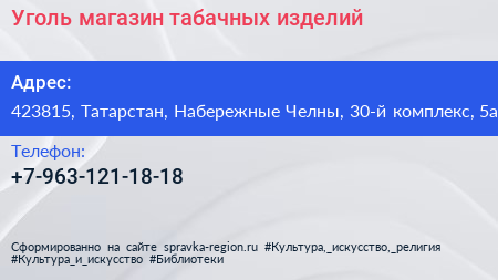 Уголь, магазин табачных изделий по адресу 423815, Татарстан, Набережные Челны, 30-й комплекс, 5а в дальнейшем Организация, размещена в следующих категориях: