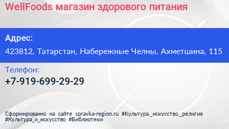 WellFoods, магазин здорового питания по адресу 423812, Татарстан, Набережные Челны, Ахметшина, 115 в дальнейшем Организация, размещена в следующих категориях: