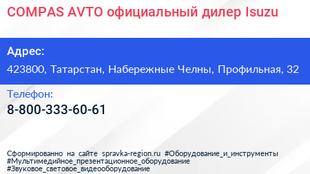 COMPAS AVTO, официальный дилер Isuzu по адресу 423800, Татарстан, Набережные Челны, Профильная, 32 в дальнейшем Организация, размещена в следующих категориях: