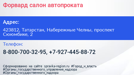 Форвард, салон автопроката по адресу 423812, Татарстан, Набережные Челны, проспект Сююмбике, 2 в дальнейшем Организация, размещена в следующих категориях: