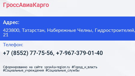ГроссАвиаКарго по адресу 423800, Татарстан, Набережные Челны, Гидростроителей, 21 в дальнейшем Организация, размещена в следующих категориях: