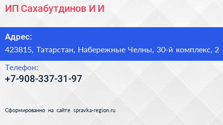 ИП Сахабутдинов И.И. по адресу 423815, Татарстан, Набережные Челны, 30-й комплекс, 2 в дальнейшем Организация, размещена в следующих категориях: