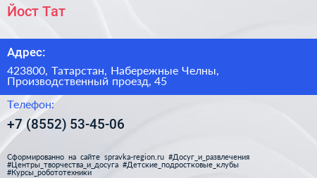Йост Тат по адресу 423800, Татарстан, Набережные Челны, Производственный проезд, 45 в дальнейшем Организация, размещена в следующих категориях: