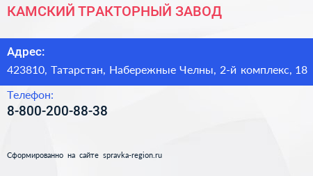 КАМСКИЙ ТРАКТОРНЫЙ ЗАВОД по адресу 423810, Татарстан, Набережные Челны, 2-й комплекс, 18 в дальнейшем Организация, размещена в следующих категориях: