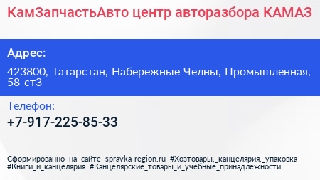 КамЗапчастьАвто, центр авторазбора КАМАЗ по адресу 423800, Татарстан, Набережные Челны, Промышленная, 58 ст3 в дальнейшем Организация, размещена в следующих категориях: