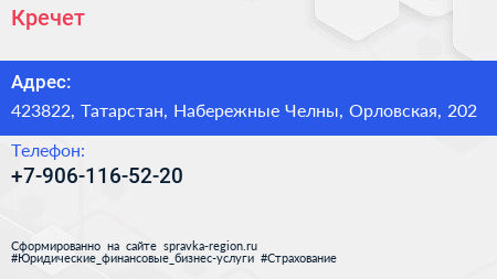 Кречет+ по адресу 423822, Татарстан, Набережные Челны, Орловская, 202 в дальнейшем Организация, размещена в следующих категориях:
