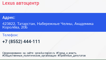 Lexus, автоцентр по адресу 423822, Татарстан, Набережные Челны, Академика Королёва, 20Б в дальнейшем Организация, размещена в следующих категориях: