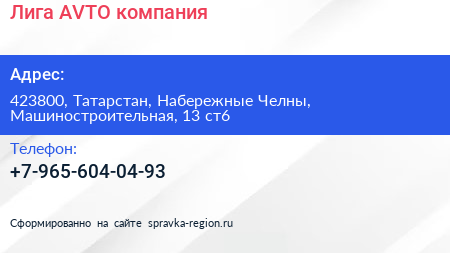 Лига AVTO, компания по адресу 423800, Татарстан, Набережные Челны, Машиностроительная, 13 ст6 в дальнейшем Организация, размещена в следующих категориях: