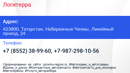 Логитерра по адресу 423800, Татарстан, Набережные Челны, Линейный проезд, 24 в дальнейшем Организация, размещена в следующих категориях: